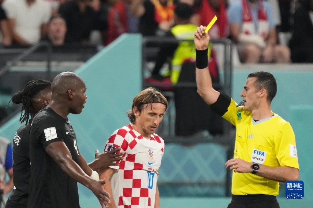 11月27日,主裁判在比賽中向克羅地亞隊球員莫德里奇(右二)與加拿大隊球員卡馬爾·米勒(右三)出示黃牌。