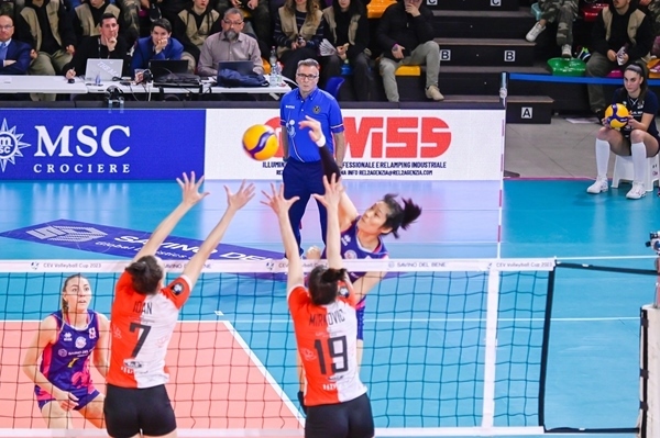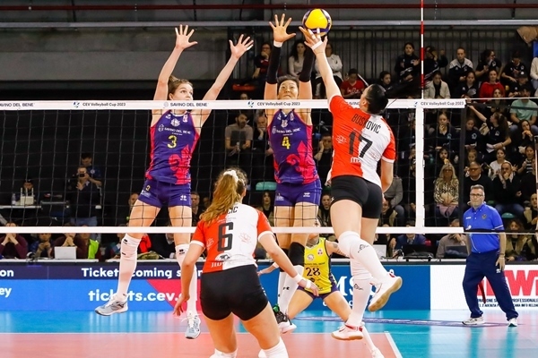 朱婷(4號)與貝麗恩攔網。圖片來源:歐聯杯官網