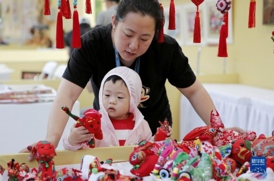 6月10日,在哈爾濱市索菲亞廣場非遺工坊展,市民在了解傳統(tǒng)手工布藝展品。