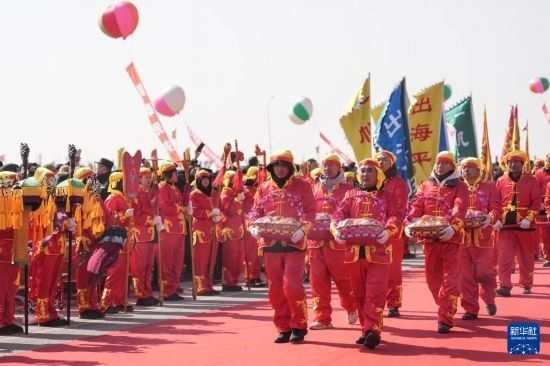 當(dāng)日,遼寧省盤錦市舉辦盤錦首屆漁雁文化節(jié)暨第六屆二界溝開海節(jié)?;顒又袧O家祭祀、非遺秧歌、舞獅等演出再現(xiàn)當(dāng)?shù)貪O雁文化,漁民也通過這樣的形式表達(dá)盼望新一年漁業(yè)豐收的美好愿望。