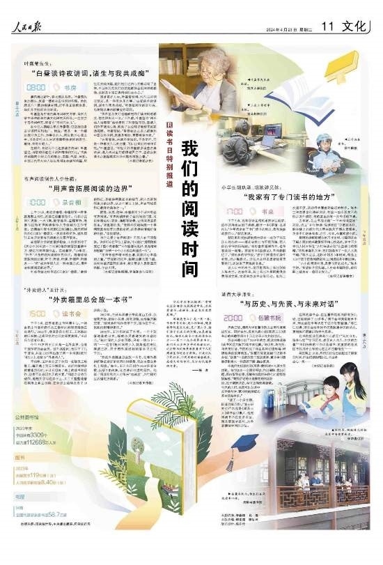 閱讀是什么?是一頁(yè)一卷,傳承千年文脈;是出行忙碌,隨身攜帶的星辰大海;是廣袤山鄉(xiāng),指引孩子們成長(zhǎng)的燈塔;也是靜謐時(shí)光,陪伴無(wú)數(shù)個(gè)日夜的詩(shī)和遠(yuǎn)方……第二十九個(gè)世界讀書日,我們關(guān)注多種多樣的閱讀時(shí)間,這些鮮活的場(chǎng)景展現(xiàn)著當(dāng)下人們閱讀生活的方方面面。讓我們從不同行業(yè)、不同年齡的讀者視角,感受文明的印記,見(jiàn)證時(shí)代進(jìn)步的力量。