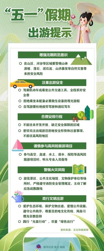 文化和旅游部建議,提前了解途經(jīng)地、目的地天氣、交通情況,關(guān)注旅游景區(qū)假期開放情況和門票預(yù)約措施,合理規(guī)劃旅游線路和時(shí)間。不前往未開發(fā)開放、缺乏安全保障的區(qū)域。密切關(guān)注出境游目的地安全形勢和注意事項(xiàng),不前往高風(fēng)險(xiǎn)地區(qū)。