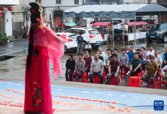 6月25日,澧浦鎮(zhèn)鄭店村百姓在觀(guān)看光南文化禮堂大舞臺(tái)上婺之靈坐唱班表演的婺劇(無(wú)人機(jī)照片)。