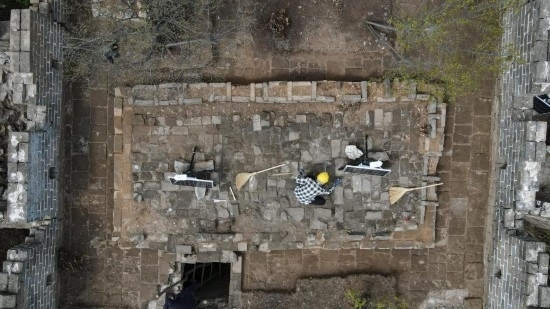工人在箭扣長城121號敵臺頂部進(jìn)行考古清理(4月30日攝,無人機(jī)照片)。目前,該敵臺已完成考古,進(jìn)入修繕施工階段。新華社記者 陳鐘昊 攝