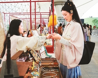 自2018年起,中國(guó)絲綢博物館每年舉辦“國(guó)絲漢服節(jié)”,吸引眾多漢服愛(ài)好者、漢服商家參加。他們不僅欣賞跨越千年的服飾文物,也從中獲得啟發(fā)和靈感。