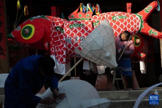 1月6日,在安徽省黃山市歙縣北岸鎮(zhèn)瞻淇村一處祠堂里,村民在制作魚燈。