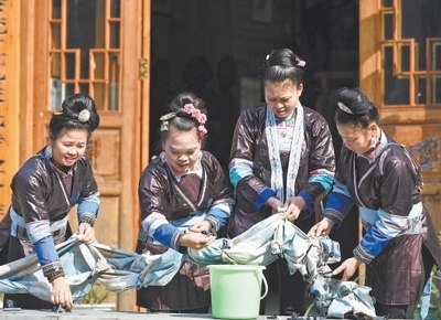 侗族婦女在扎染侗布。