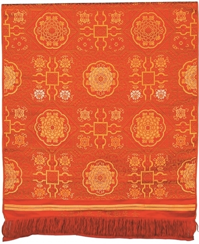 宋錦主產(chǎn)地為蘇州,與云錦、蜀錦并稱為中國(guó)古代三大名錦。宋錦采用經(jīng)線緯線聯(lián)合顯花的組織結(jié)構(gòu)和彩拋換色工藝,風(fēng)格古樸典雅,在古代多用于書畫裝裱,有著獨(dú)特的藝術(shù)魅力。清代紅地如意牡丹紋天華錦為宮廷用宋式錦,紅緞地上以彩色絲線和金線作緯顯花,圖案基本骨架為典型的宋錦紋樣——“米”字狀八達(dá)暈式樣,飾有牡丹、蓮花、如意紋等,寓意富貴安康、吉祥如意。