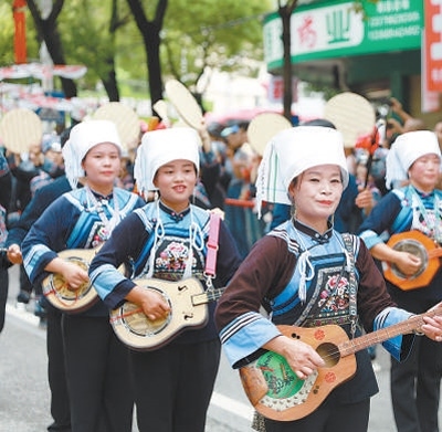 貴州惠水巡游踩街上演布依八音彈唱。