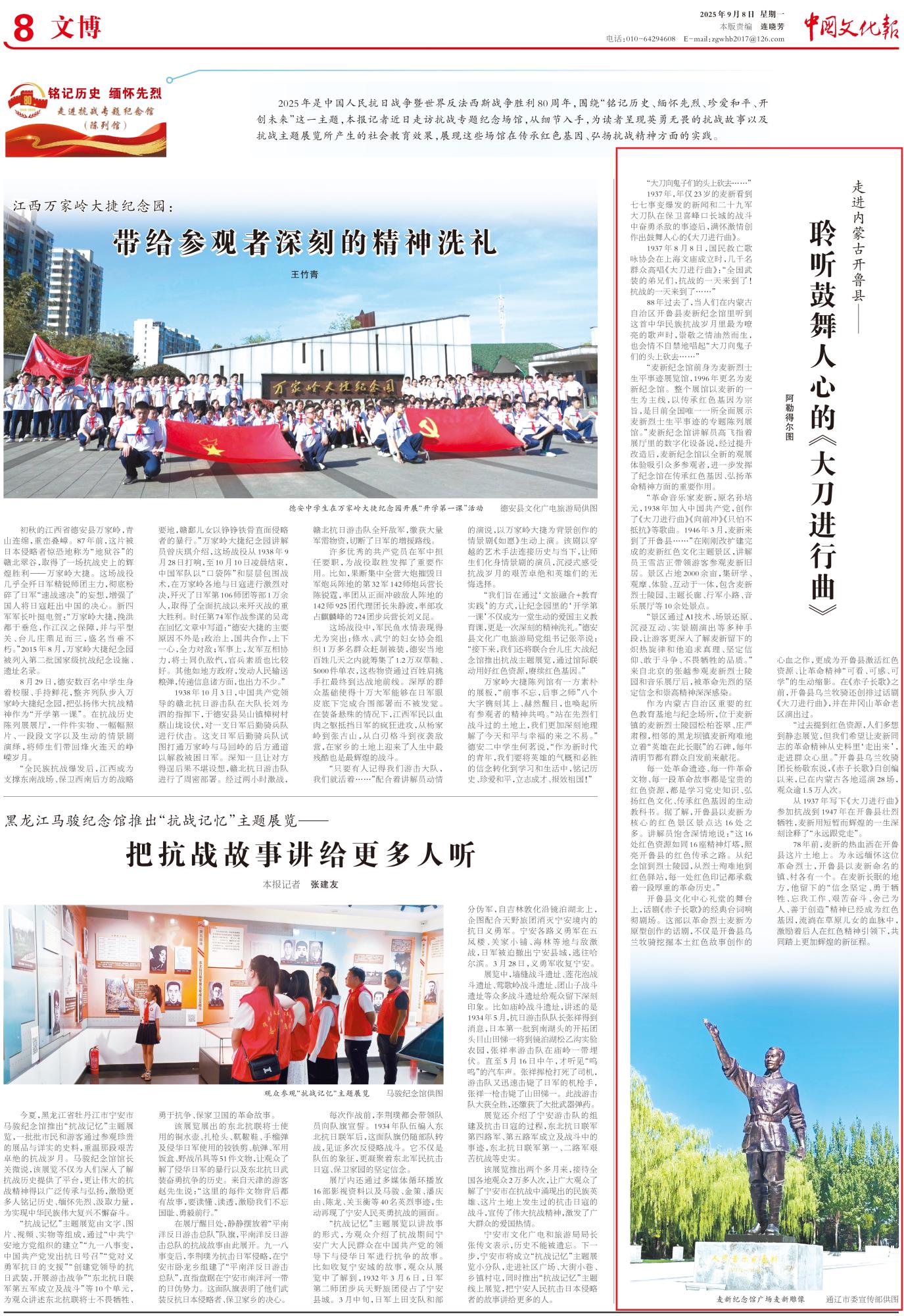 2025年9月8日,《中國文化報(bào)》第8版整版刊發(fā)題為《走進(jìn)內(nèi)蒙古開魯縣——聆聽鼓舞人心的《大刀進(jìn)行曲》》的文章,報(bào)道了內(nèi)蒙古開魯縣麥新紀(jì)念館以麥新的一生為主線,以傳承紅色基因?yàn)樽谥迹悄壳叭珖ㄒ灰凰嬲故钧溞铝沂可绞论E的專題陳列展館。經(jīng)過提升改造后,麥新紀(jì)念館以全新的觀展體驗(yàn)吸引眾多參觀者,進(jìn)一步發(fā)揮了紀(jì)念館在傳承紅色基因、弘揚(yáng)革命精神方面的重要作用。