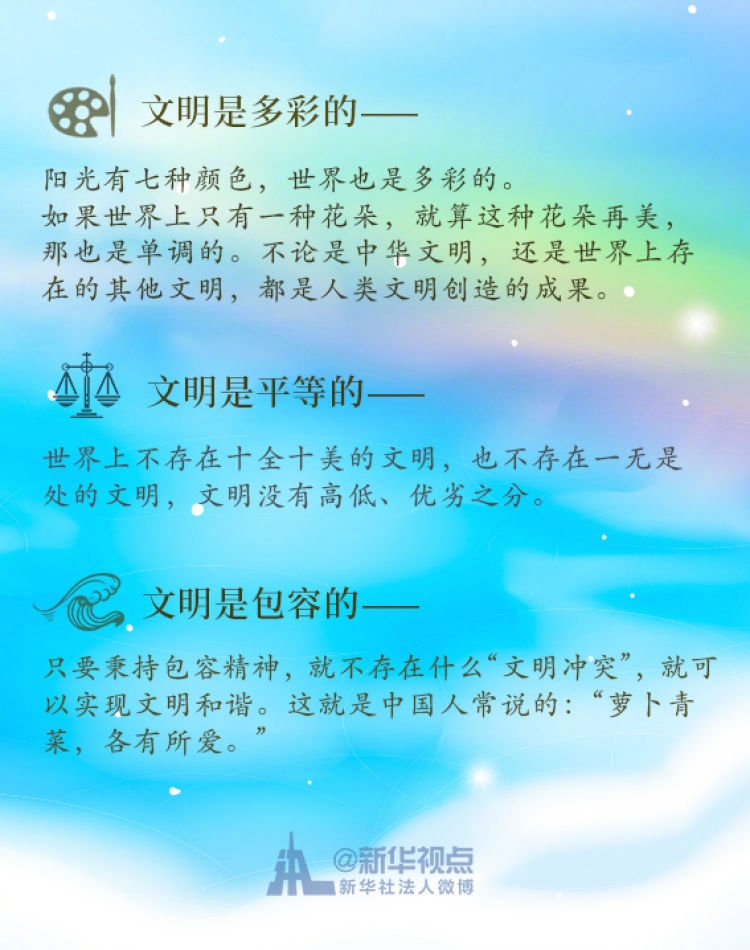 在這次演講中,習(xí)近平主席用生動的語言講明了對待不同文明應(yīng)有的態(tài)度和原則: