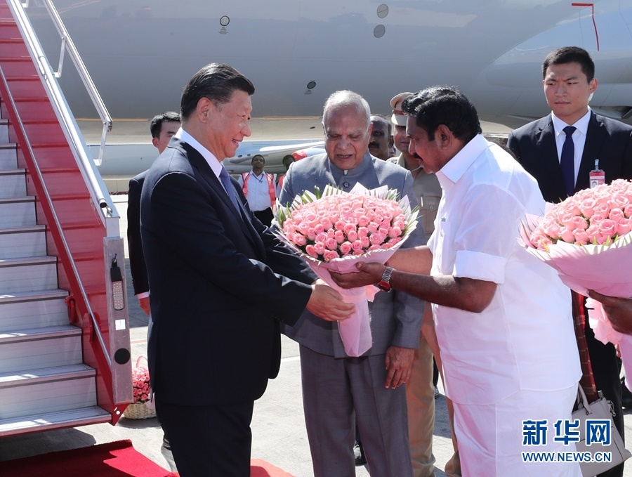 10月11日,國家主席習近平乘專機抵達金奈,應印度共和國總理莫迪邀請,出席中印領(lǐng)導人第二次非正式會晤。印度泰米爾納德邦邦長普羅希特、首席部長帕拉尼斯瓦米等在舷梯旁迎接,向習近平敬獻鮮花。