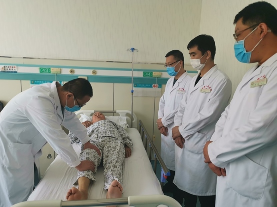 骨一科喬強主任為關節(jié)置換術后患者功能鍛煉。