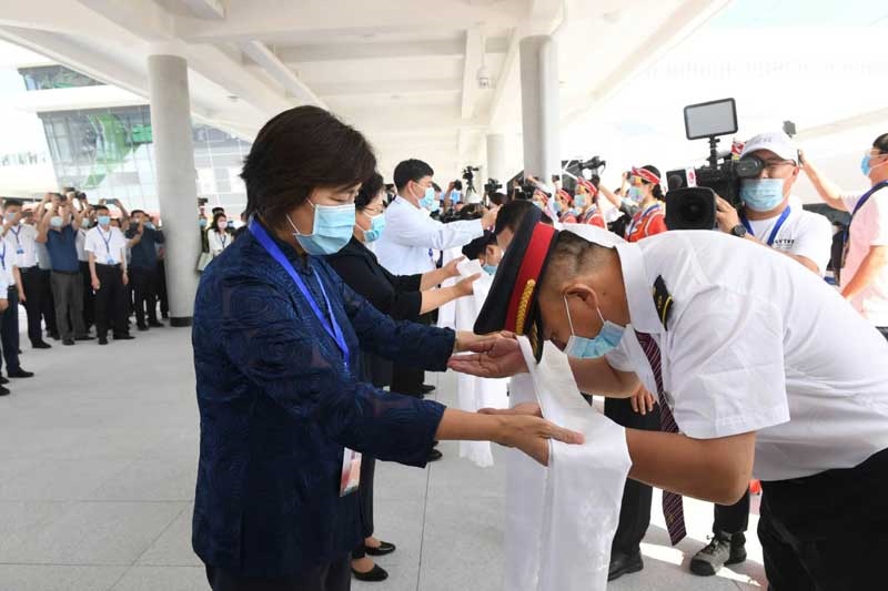 自治區(qū)黨委副書(shū)記、自治區(qū)主席布小林宣布赤喀高鐵正式開(kāi)通運(yùn)營(yíng),并與自治區(qū)副主席艾麗華、自治區(qū)政府秘書(shū)長(zhǎng)包振玉以及中國(guó)鐵路沈陽(yáng)局集團(tuán)有限公司、蒙遼鐵路客運(yùn)專線有限責(zé)任公司、赤峰市委負(fù)責(zé)同志一起為列車組人員敬獻(xiàn)哈達(dá)。