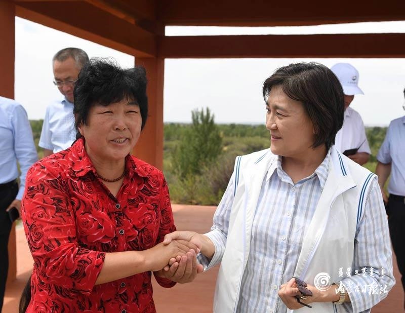 烏蘭陶勒蓋治沙站位于烏審旗毛烏素沙地腹部,建站40多年來,以治沙造林、保護(hù)森林資源為己任,一代接著一代干,防沙治沙工作取得了明顯成效。布小林來到烏蘭陶勒蓋治沙站,調(diào)研治沙造林工作,并與全國“三八·綠色獎(jiǎng)?wù)隆鲍@得者殷玉珍親切交流,對當(dāng)?shù)厣鷳B(tài)治理的模式和成效給予肯定。她還來到伊金霍洛旗紅慶河鎮(zhèn),考察鄉(xiāng)村治理、消費(fèi)扶貧等工作。