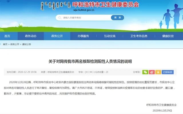 2020年12月28日晚,呼和浩特市疾控中心收到內(nèi)蒙古國際蒙醫(yī)院檢出兩名新冠病毒核酸可疑陽性的報告。按照疫情防控處置規(guī)范要求,市疾控中心立即對兩名可疑陽性人員進行了兩次復檢,復檢結果均為陰性。請廣大市民不信謠、不傳謠,繼續(xù)按照新冠肺炎疫情常態(tài)化防控要求做好自身防護,戴口罩,勤洗手,少聚集,非必要不要前往中高風險地區(qū),共同維護我市疫情防控良好局面。