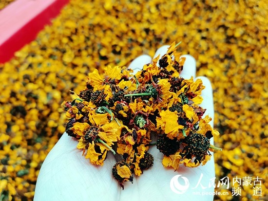 已經(jīng)烘干的雪菊依然金燦燦。人民網(wǎng) 王慧攝