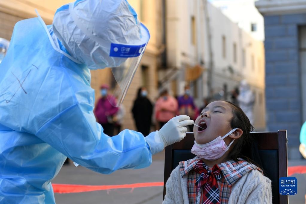10月20日,在因疫情封控的阿拉善盟額濟納旗達來呼布鎮(zhèn)天賦佳苑小區(qū)內(nèi),醫(yī)務(wù)人員為居民進行核酸采樣。新華社記者 貝赫 攝