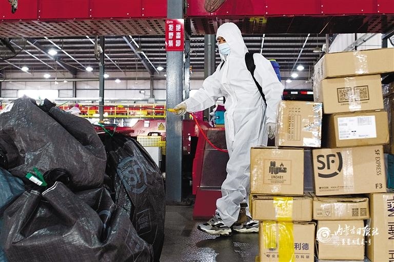 11月18日,內(nèi)蒙古順豐速運(yùn)有限公司呼和浩特市金山分揀中心的工作人員正在對(duì)快遞包裹進(jìn)行消毒。連日來(lái),我區(qū)各快遞企業(yè)加強(qiáng)投遞、攬收等一線(xiàn)從業(yè)人員個(gè)人防護(hù),對(duì)到場(chǎng)地的快遞包裹執(zhí)行每天定時(shí)消殺工作,全力保障每一單快遞的安全。(內(nèi)蒙古日?qǐng)?bào)記者 懷特烏勒斯攝)