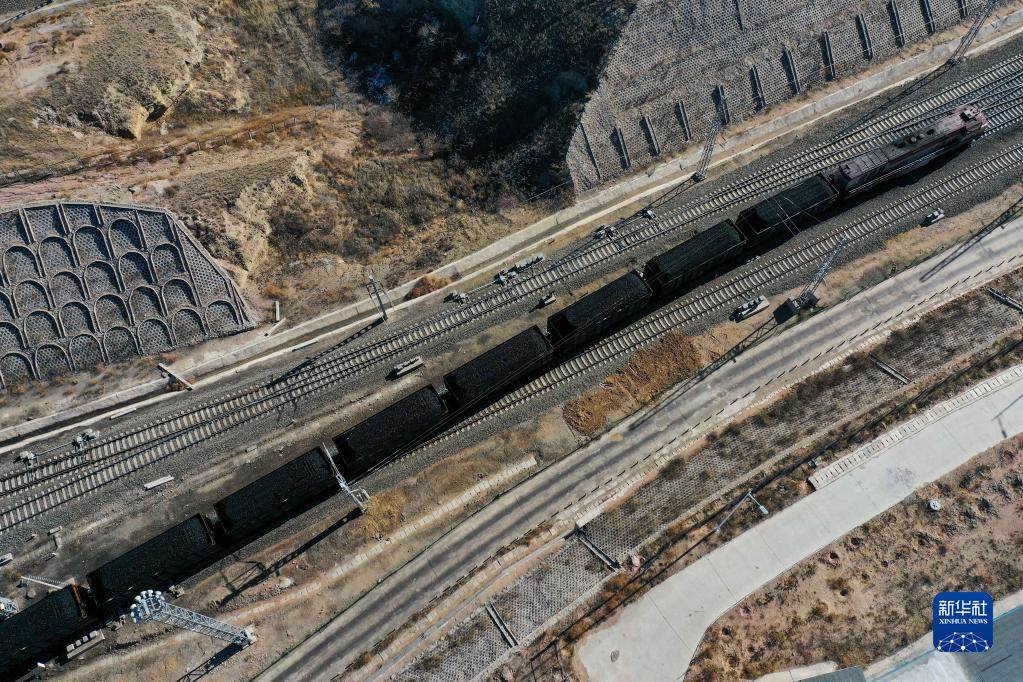 這是11月23日在位于鄂爾多斯市的淮河能源西部煤電集團色連二礦罕臺川集裝站拍攝的正在裝煤的列車(無人機照片)。新華社記者李志鵬攝