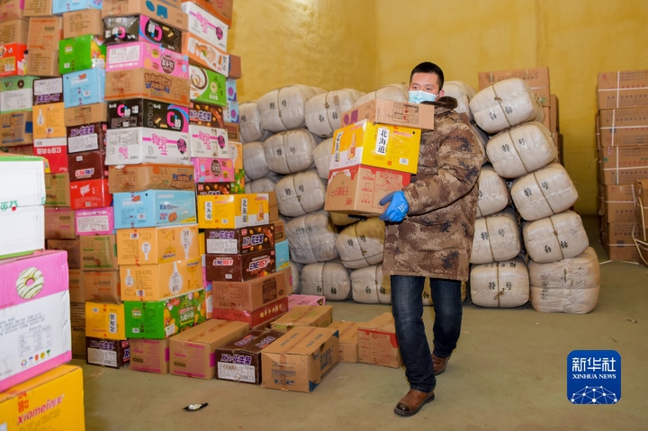 12月7日,在滿洲里市一物資儲備庫,工作人員王永亮在搬運物資。新華社記者魏婧宇 攝
