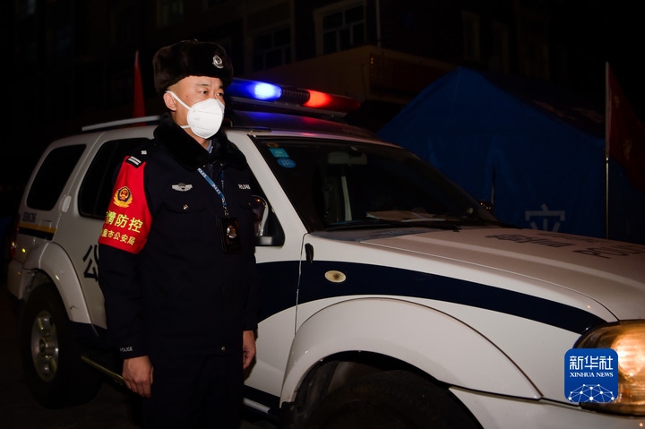 深夜安靜的街道上亮起了兩盞車燈,燈光中是正在巡邏的滿洲里市公安局道南派出所民警王滿。王滿和同事負責新世界小區(qū)B區(qū)的外圍管控工作,看到街邊有商鋪亮著燈,他站在門外大聲叮囑里面的人千萬不能出門,同事在他身后幾米處用車燈給他照明。