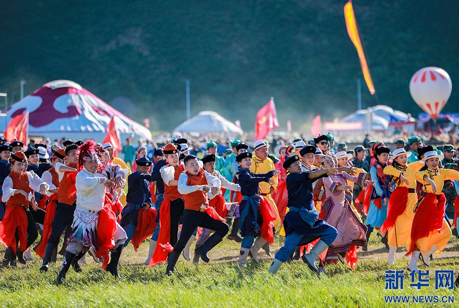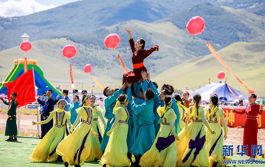 8月8日,烏蘭牧騎的隊員在開幕式上踏歌起舞。新華網(wǎng)發(fā)(丁根厚攝)