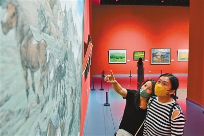 “美麗中國·內(nèi)蒙古形象”主題美術(shù)作品展聚焦“兩個打造”,119幅美術(shù)作品以全區(qū)12個盟市獨特的自然風光、人文景觀、生態(tài)面貌為底色,描繪內(nèi)蒙古草之茂、林之郁、湖之美、水之秀、田之沃、沙之魅,全面展示了內(nèi)蒙古真善美的形象。記者 王磊 攝