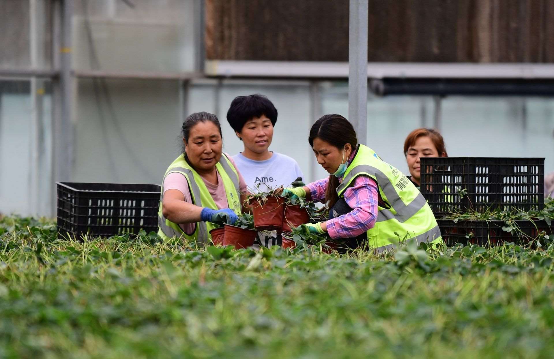 幾位村民正在一棟日光溫室里種植西紅柿