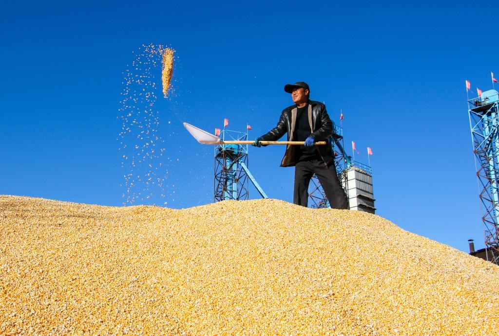 10月18日,在奈曼旗新鎮(zhèn)舍布日?qǐng)D嘎查的一家收糧站,一名工人在晾曬玉米。(新華社記者連振 攝)