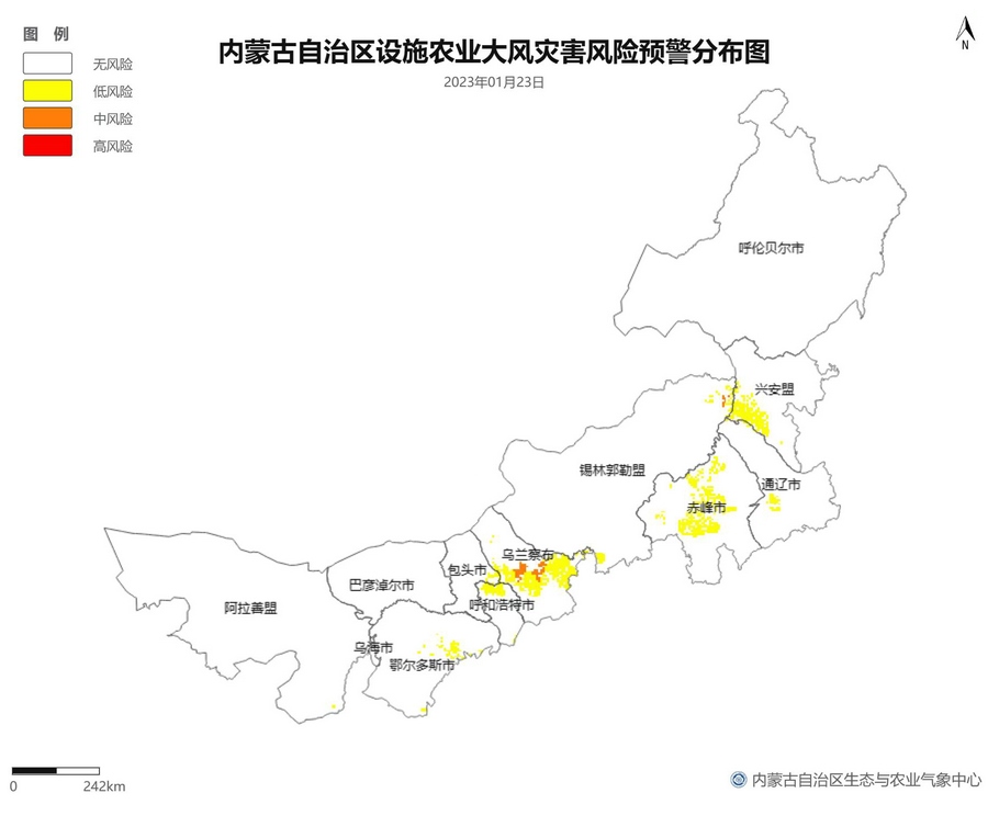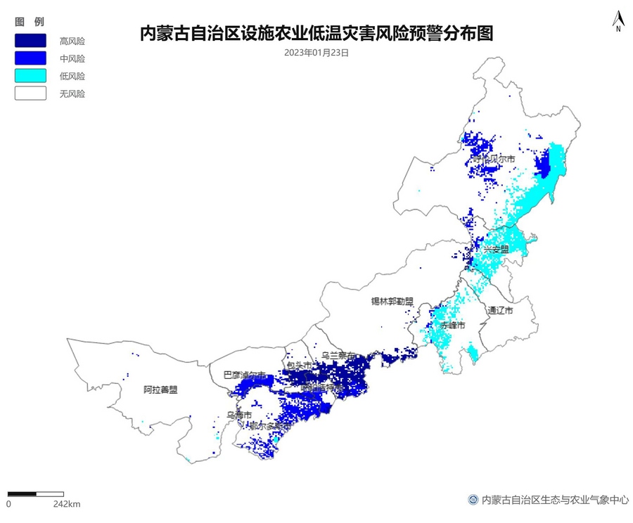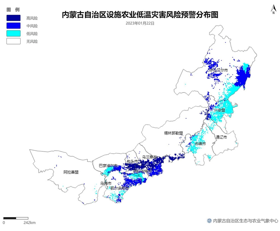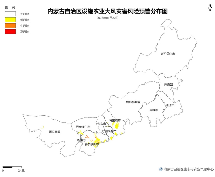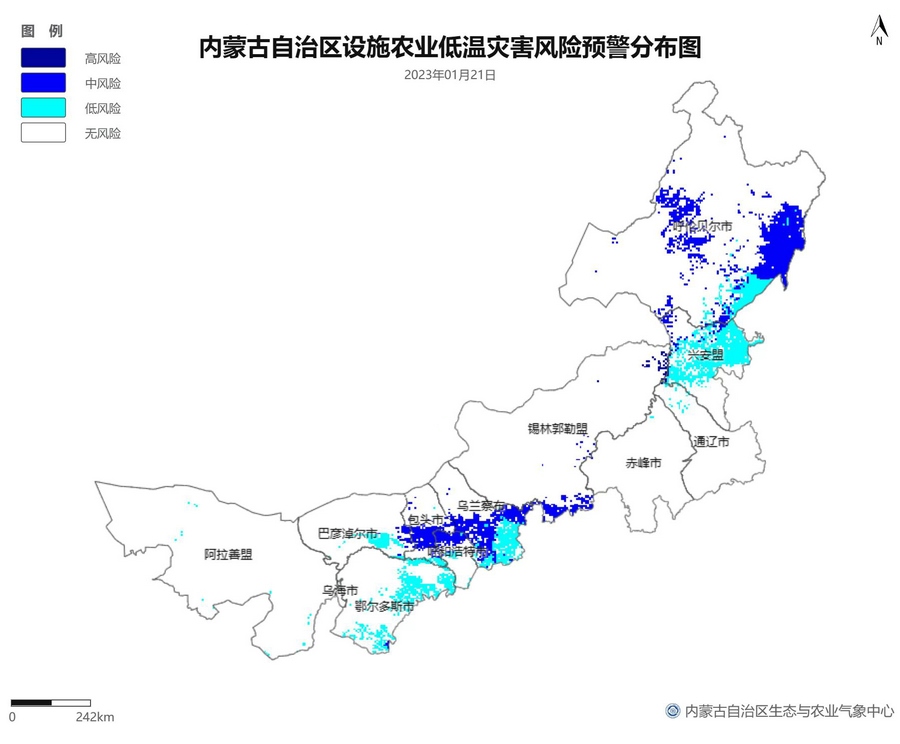 根據(jù)智能網(wǎng)格預報數(shù)據(jù),結(jié)合設施農(nóng)業(yè)低溫災害和風災指標,1月21日至23日,呼倫貝爾市東南部、東南部偏西地區(qū)為設施農(nóng)業(yè)低溫災害低風險地區(qū),東北部中部及東部、中部偏南大部、西部偏東部分地區(qū)為設施農(nóng)業(yè)低溫災害中或高風險地區(qū),低溫災害將導致作物生長緩慢和受凍;21至23日,東南部部分地區(qū)、中部偏西南局部地區(qū)及鄂爾多斯市零星地區(qū)為設施農(nóng)業(yè)風災低風險地區(qū),其中,22日鄂爾多斯市北部零星地區(qū)、23日錫林郭勒盟東部零星地區(qū)、烏蘭察布市中部局部地區(qū)為設施農(nóng)業(yè)風災中或高風險地區(qū),風災易造成溫室結(jié)構(gòu)受損。