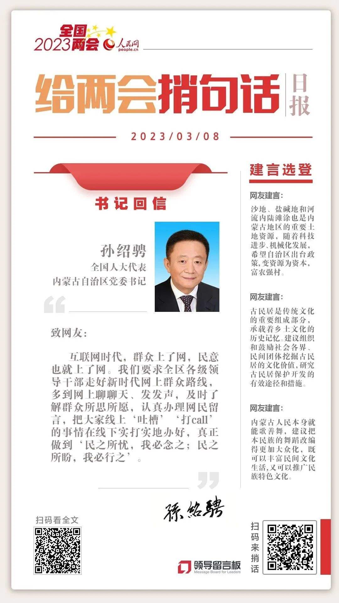 人民網(wǎng)2023年度“我給兩會捎句話”建言征集活動正在進行,廣大網(wǎng)友關注并積極參與。近日,部分中央部委領導,地方的省委書記、省長陸續(xù)通過人民網(wǎng)致信網(wǎng)友,回應群眾關切。人民網(wǎng)將持續(xù)刊發(fā)。