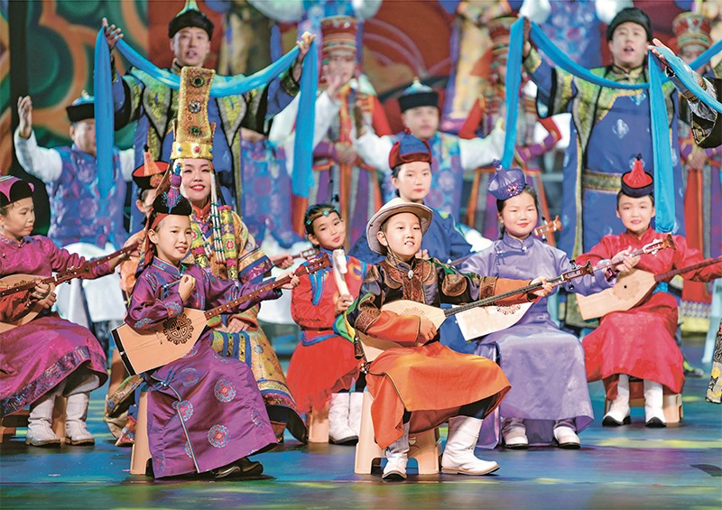 2022年9月4日,第八屆全國少數民族曲藝展演在內蒙古自治區(qū)鄂爾多斯市開演。圖為演員在展演中表演蒙古族祝贊詞《禮贊新時代》。 人民圖片