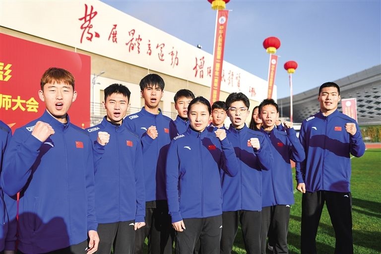 即將參加第一屆全國學(xué)生(青年)運動會的我區(qū)運動員在動員大會上高呼“團結(jié)拼搏、勇創(chuàng)佳績”
