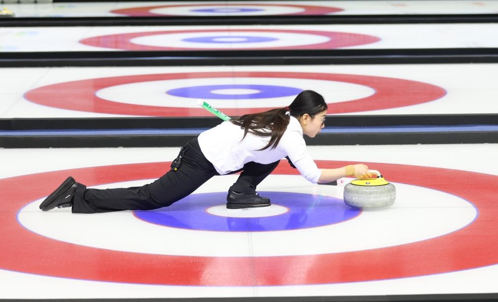 ??1月12日,文馨悅在比賽中擲壺。在第十四屆全國冬季運(yùn)動會冰壺青年組混雙金牌賽中,黑龍江隊選手李思霖/文馨悅奪得金牌。新華社記者 王楷焱 攝