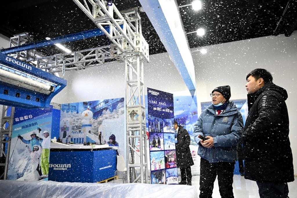 ??2023年12月16日,市民在展銷會上觀看飄雪機(jī)飄雪。當(dāng)日,2023年首屆呼倫貝爾·海拉爾冰雪產(chǎn)品冬季展銷會在內(nèi)蒙古呼倫貝爾市海拉爾區(qū)開幕。新華社記者 貝赫 攝