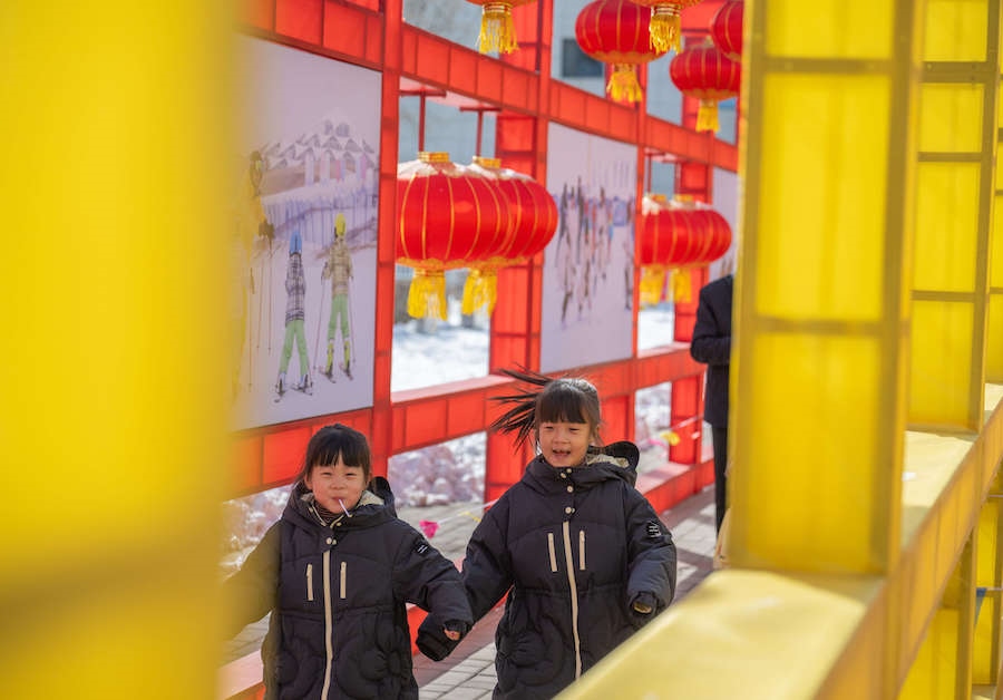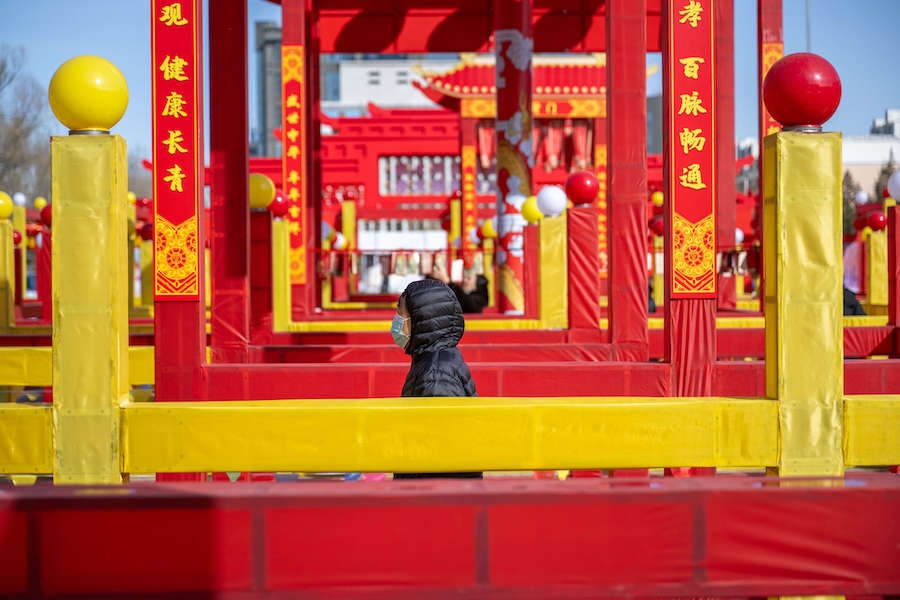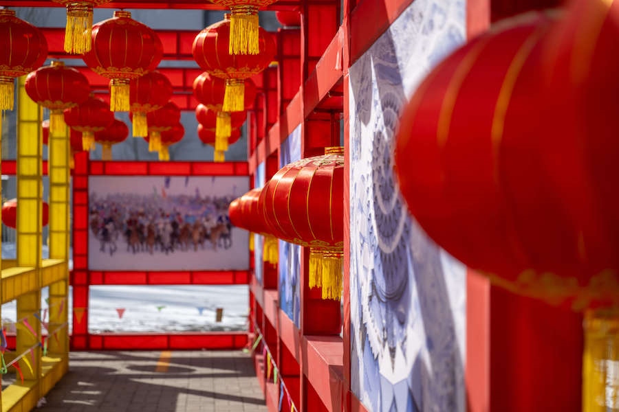 在內蒙古展覽館的九曲陣中設有八個關口,每個關口懸掛著印有感黨恩、北疆文化、冰雪旅游、中華詩詞、傳統(tǒng)年俗等有關的知識問答彩旗。