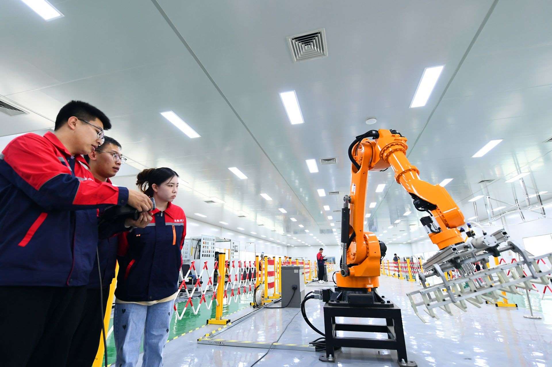 包頭稀土高新技術產業(yè)開發(fā)區(qū)高新技術特色產業(yè)基地北科交大機器人展廳,工作人員正在調試碼垛轉運六軸機器人。草原全媒記者金泉攝