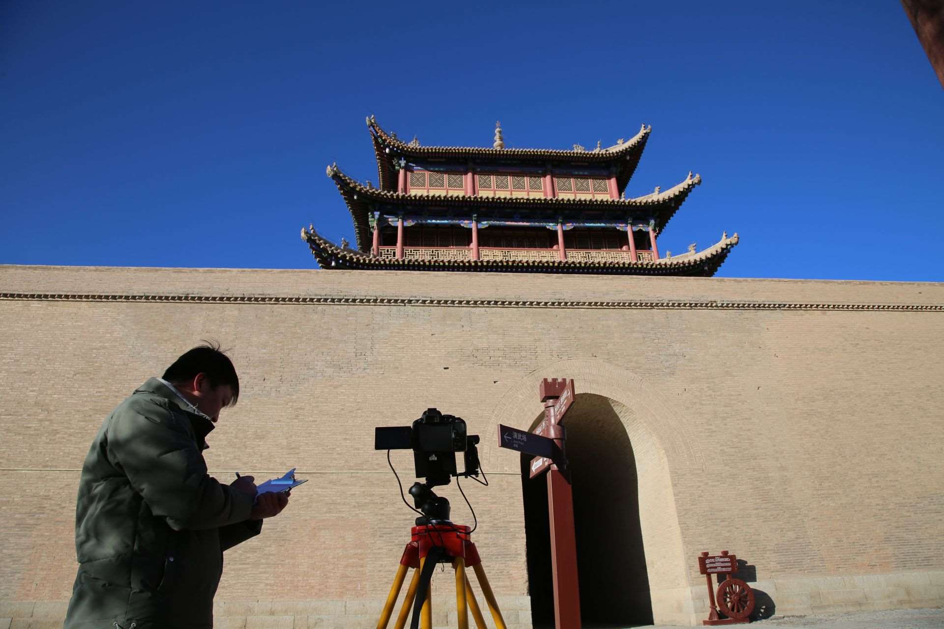 1月29日,嘉峪關絲路(長城)文化研究院文化遺產(chǎn)監(jiān)測中心工作人員高商,正在對柔遠樓城臺裂縫進行定期監(jiān)測。嘉峪關絲路(長城)文化研究院供圖