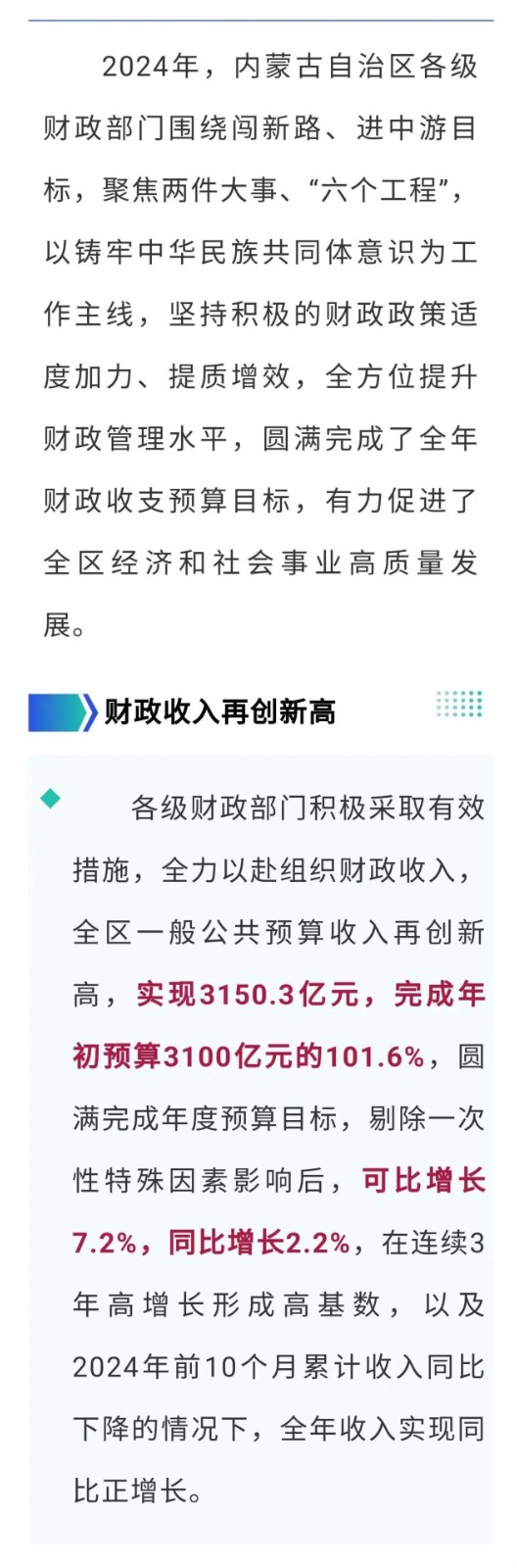 2025年,全區(qū)各級財(cái)政部門將以習(xí)近平新時(shí)代中國特色社會主義思想為指導(dǎo),全面貫徹黨的二十大和二十屆二中、三中全會精神,按照自治區(qū)黨委和政府的決策部署,堅(jiān)持以政領(lǐng)財(cái)、以財(cái)輔政,圍繞實(shí)施更加積極的財(cái)政政策,著力服務(wù)保障自治區(qū)大事要事,堅(jiān)定不移推動(dòng)貫穿“一條主線”、辦好兩件大事、完成“五大任務(wù)”、實(shí)施“六個(gè)工程”、開展“六個(gè)行動(dòng)”落地落實(shí),為奮力書寫中國式現(xiàn)代化內(nèi)蒙古新篇章貢獻(xiàn)財(cái)政力量。