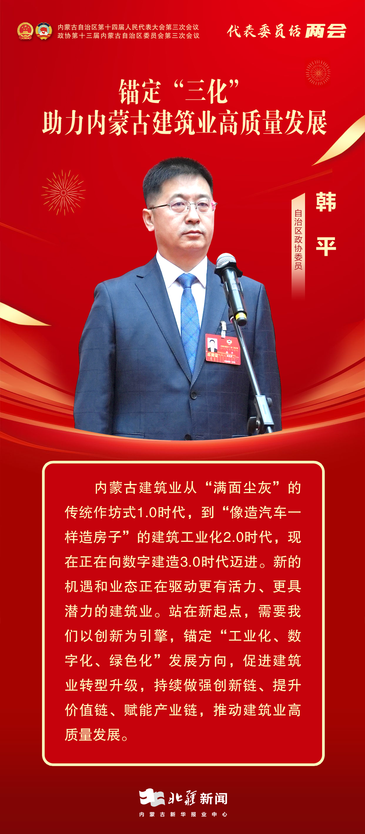 北疆新聞呼和浩特1月13日電(記者 張?chǎng)?李姝廷)委員通道,通民心、道發(fā)展。1月13日上午,自治區(qū)兩會(huì)首場(chǎng)“委員通道”正式開(kāi)啟。自治區(qū)政協(xié)委員,興泰建設(shè)集團(tuán)有限公司黨委書記、董事長(zhǎng)韓平圍繞“建筑業(yè)高質(zhì)量發(fā)展”的內(nèi)容建真言、獻(xiàn)良策。