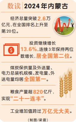 2024年,內(nèi)蒙古完成防沙治沙面積1954萬畝;新能源建設(shè)領(lǐng)跑全國,煤炭保供量及外送量、電力總裝機(jī)規(guī)模、發(fā)電量、外送電量均居全國第一,稀土產(chǎn)業(yè)產(chǎn)值突破千億元;糧食產(chǎn)量超820億斤,實(shí)現(xiàn)“二十一連豐”;陸路口岸貨運(yùn)量突破1.2億噸。
