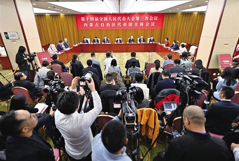 3月6日下午,十四屆全國(guó)人大三次會(huì)議內(nèi)蒙古代表團(tuán)在駐地舉行全團(tuán)會(huì)議,本次全團(tuán)會(huì)議向參加全國(guó)兩會(huì)報(bào)道的中外媒體開放。蓬勃發(fā)展的亮麗內(nèi)蒙古吸引了29家中外媒體的57名記者到場(chǎng)采訪,感受內(nèi)蒙古發(fā)展的蓬勃力量,講述全區(qū)上下深入落實(shí)習(xí)近平總書記的重要指示精神,貫穿一條主線,辦好兩件大事,弘揚(yáng)蒙古馬精神,闖新路進(jìn)中游的改革故事。