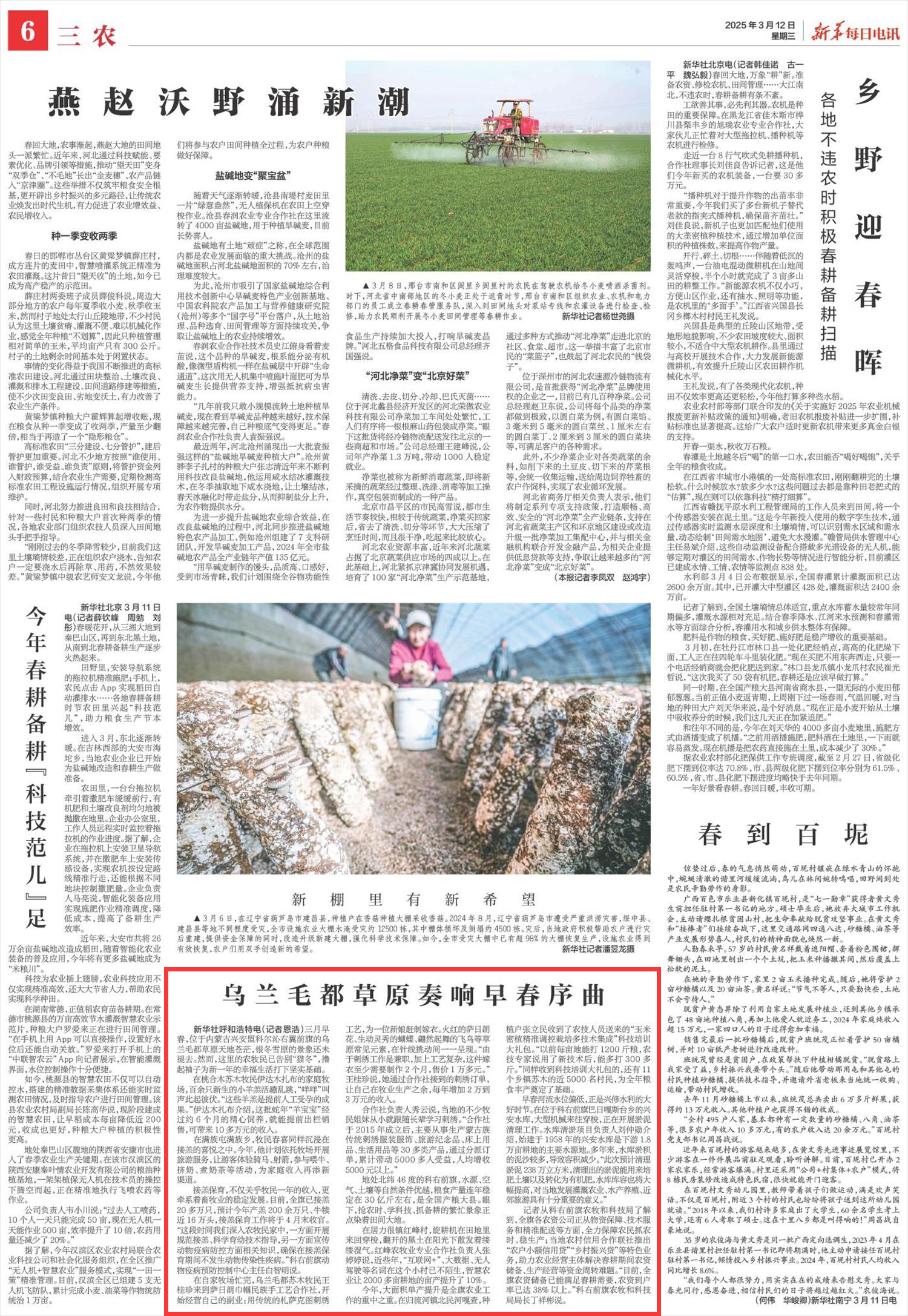 2025年3月12日,《新華每日電訊》第6版刊發(fā)題為《烏蘭毛都草原奏響早春序曲》的文章,報道了三月早春,位于內(nèi)蒙古興安盟科爾沁右翼前旗的烏蘭毛都草原天地蒼茫,銀冬雪原的景象還未褪去。然而,這里的農(nóng)牧民已告別“貓冬”,擼起袖子為新一年的幸福生活打下堅實基礎(chǔ)。