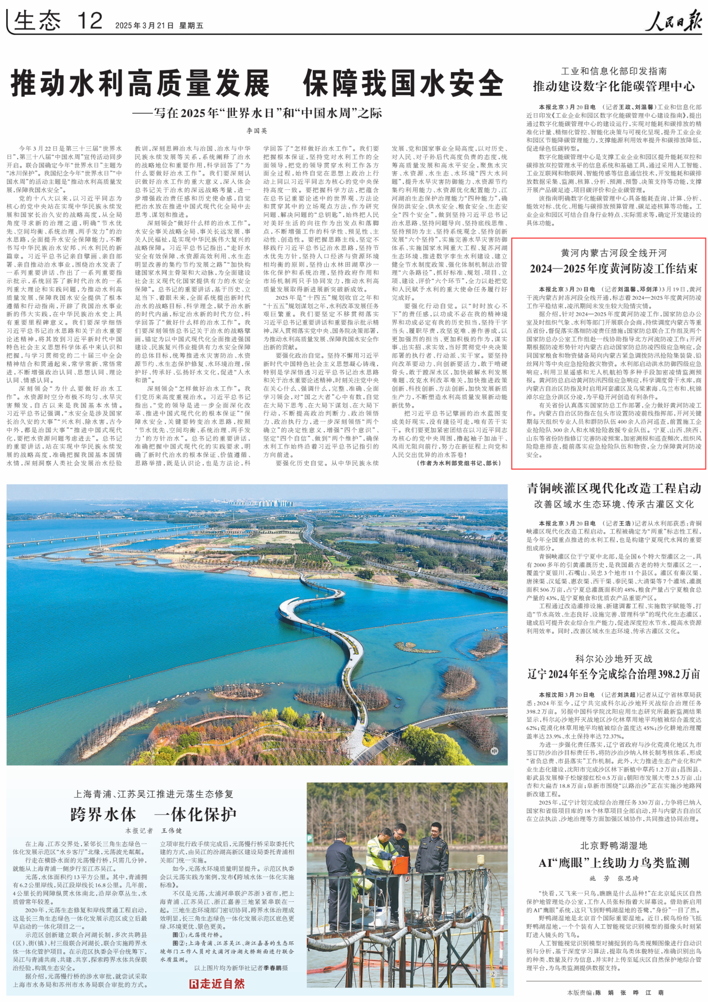 2025年3月21日,《人民日?qǐng)?bào)》第12版刊發(fā)題為《黃河內(nèi)蒙古河段全線開河 2024—2025年度黃河防凌工作結(jié)束》的文章,報(bào)道了黃河干流內(nèi)蒙古封凍河段3月19日全線開通,標(biāo)志著2024—2025年度黃河防凌工作平穩(wěn)結(jié)束,凌汛期間未發(fā)生較大險(xiǎn)情災(zāi)情。