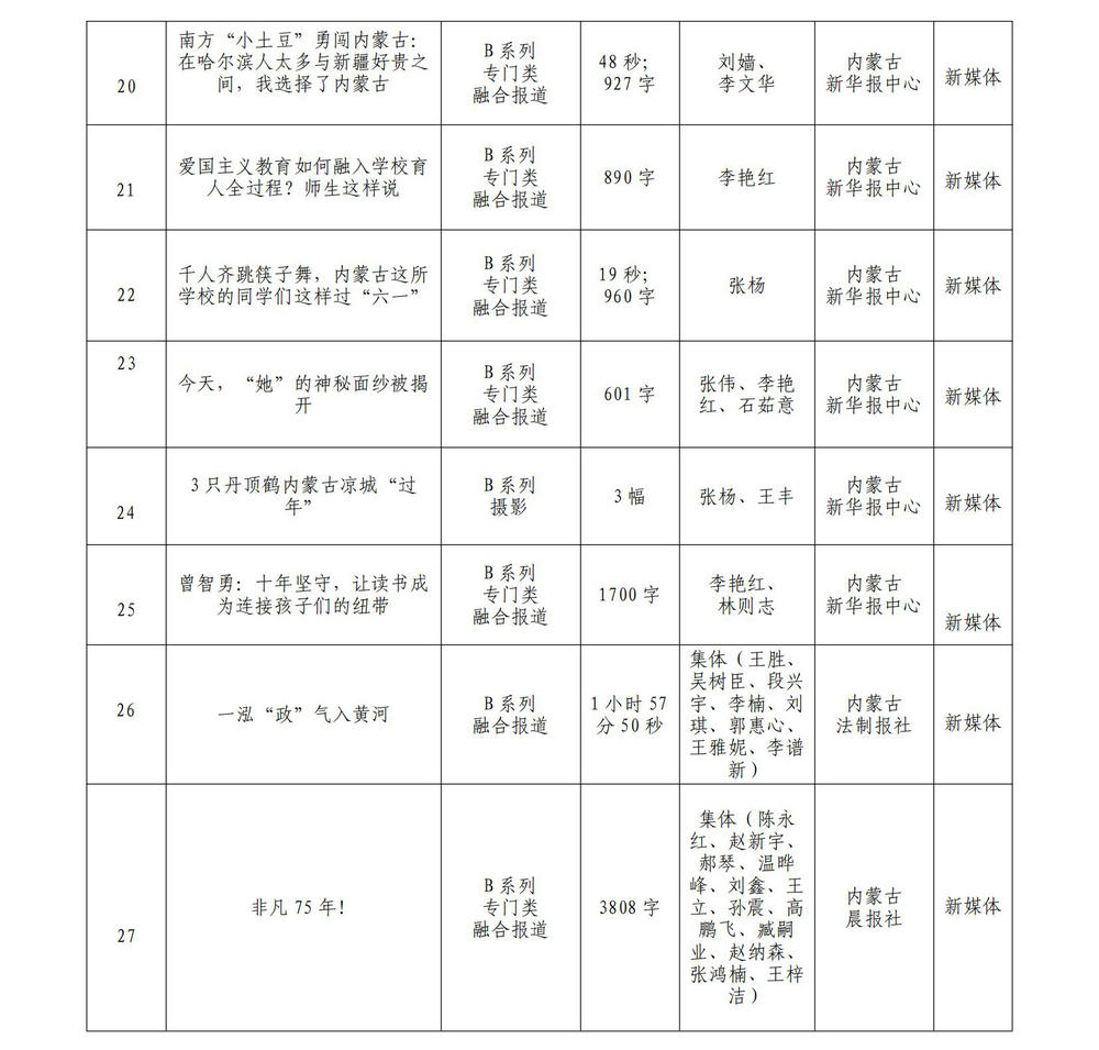 按照新聞獎評選辦法要求,內(nèi)蒙古新華報業(yè)中心現(xiàn)對擬報送第33屆內(nèi)蒙古新聞獎暨第35屆中國新聞獎參評作品進(jìn)行公示,歡迎社會各界監(jiān)督、評議。