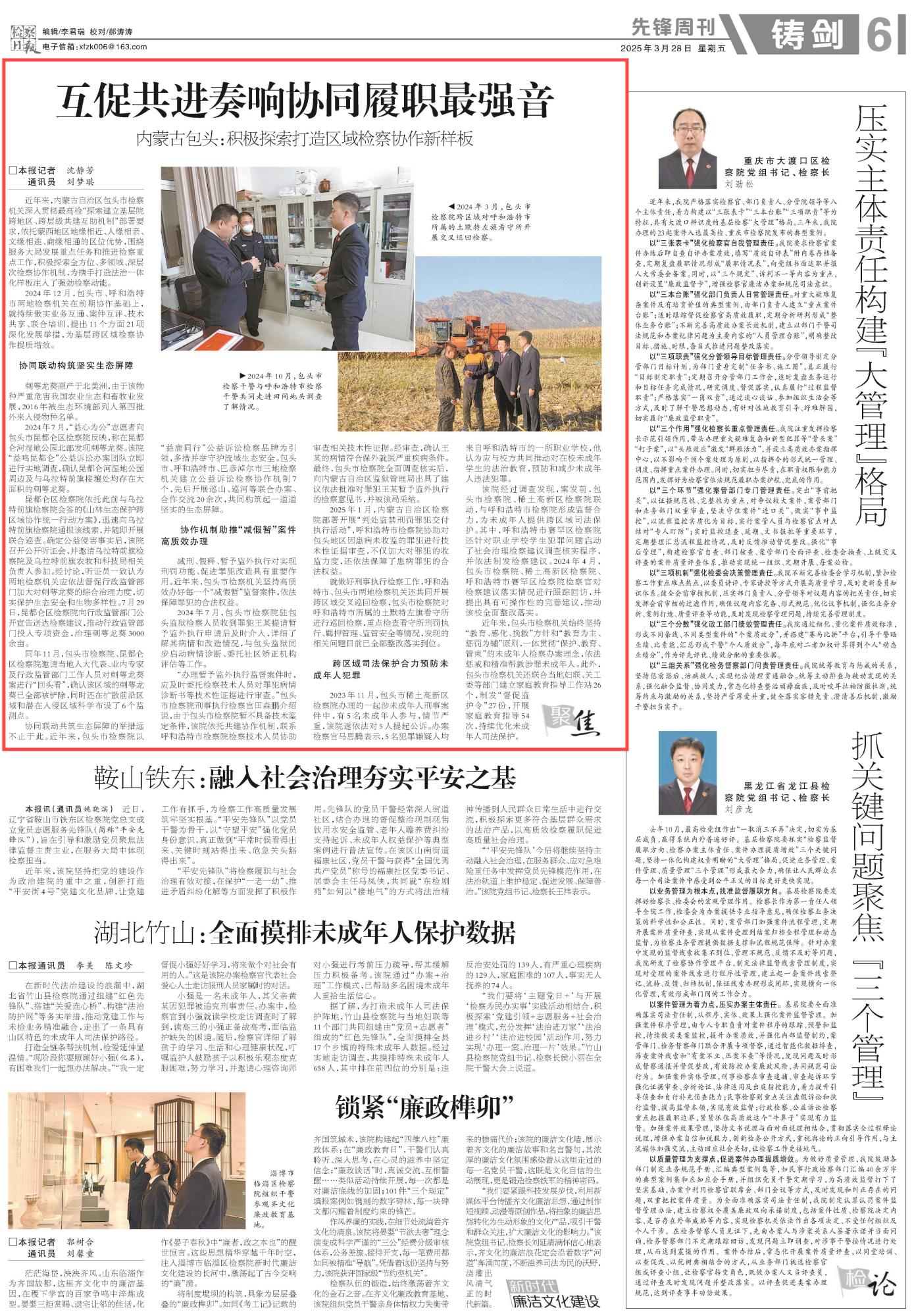 2025年3月28日,《檢察日報(bào)》第6版刊發(fā)題為《互促共進(jìn)奏響協(xié)同履職最強(qiáng)音 內(nèi)蒙古包頭:積極探索打造區(qū)域檢察協(xié)作新樣板》的文章,報(bào)道了內(nèi)蒙古自治區(qū)包頭市檢察機(jī)關(guān)深入貫徹最高檢“探索建立基層院跨地區(qū)、跨層級(jí)共建互助機(jī)制”部署要求,積極探索全方位、多領(lǐng)域、深層次檢察協(xié)作機(jī)制,為攜手打造法治一體化樣板注入了強(qiáng)勁檢察動(dòng)能。