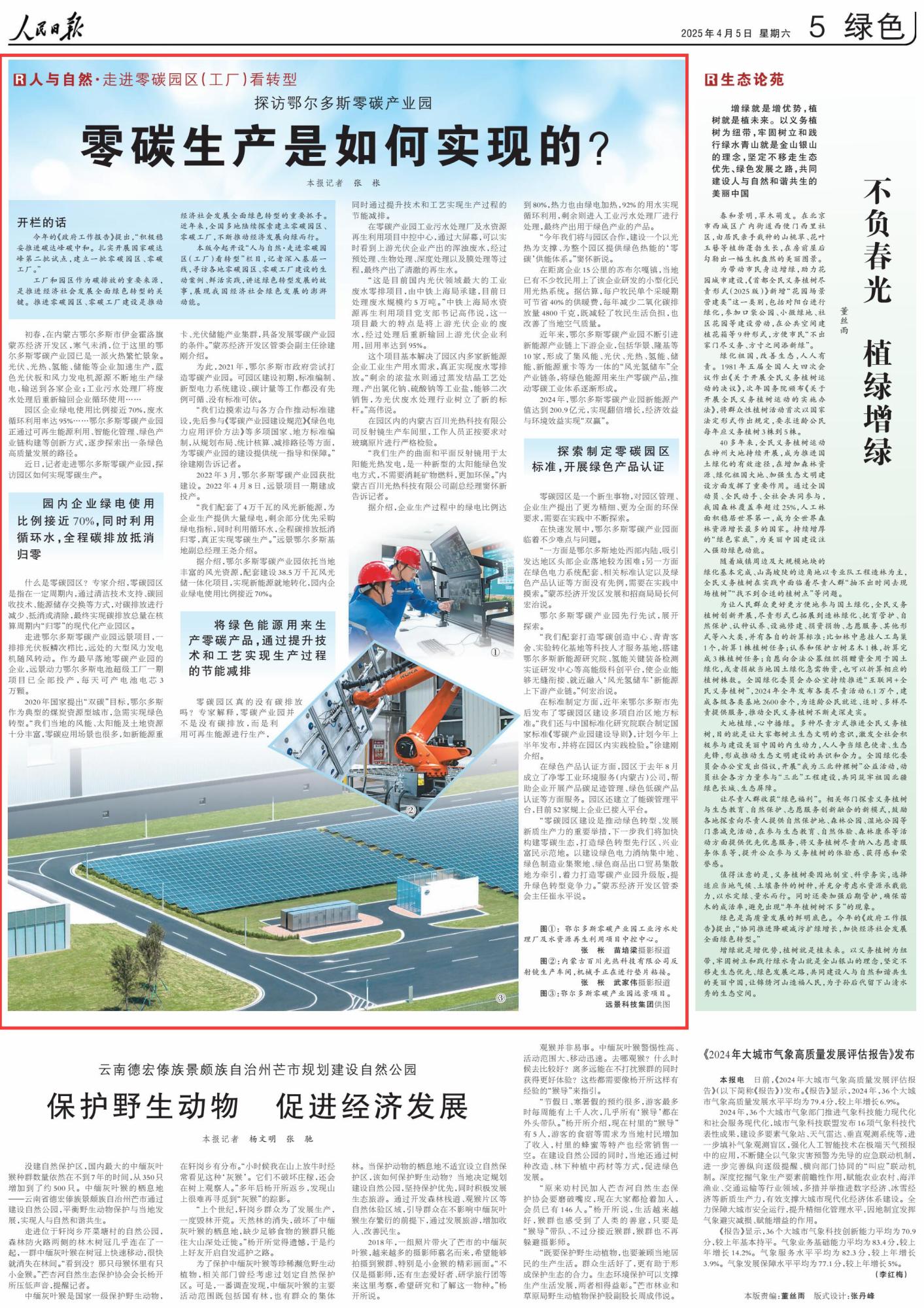 2025年4月5日,《人民日報》第5版刊發(fā)題為《探訪鄂爾多斯零碳產(chǎn)業(yè)園 零碳生產(chǎn)是如何實現(xiàn)的?》的文章,報道了鄂爾多斯零碳產(chǎn)業(yè)園通過可再生能源利用、智能化管理、綠色產(chǎn)業(yè)鏈構建等創(chuàng)新方式,逐步探索出一條綠色高質(zhì)量發(fā)展的路徑。