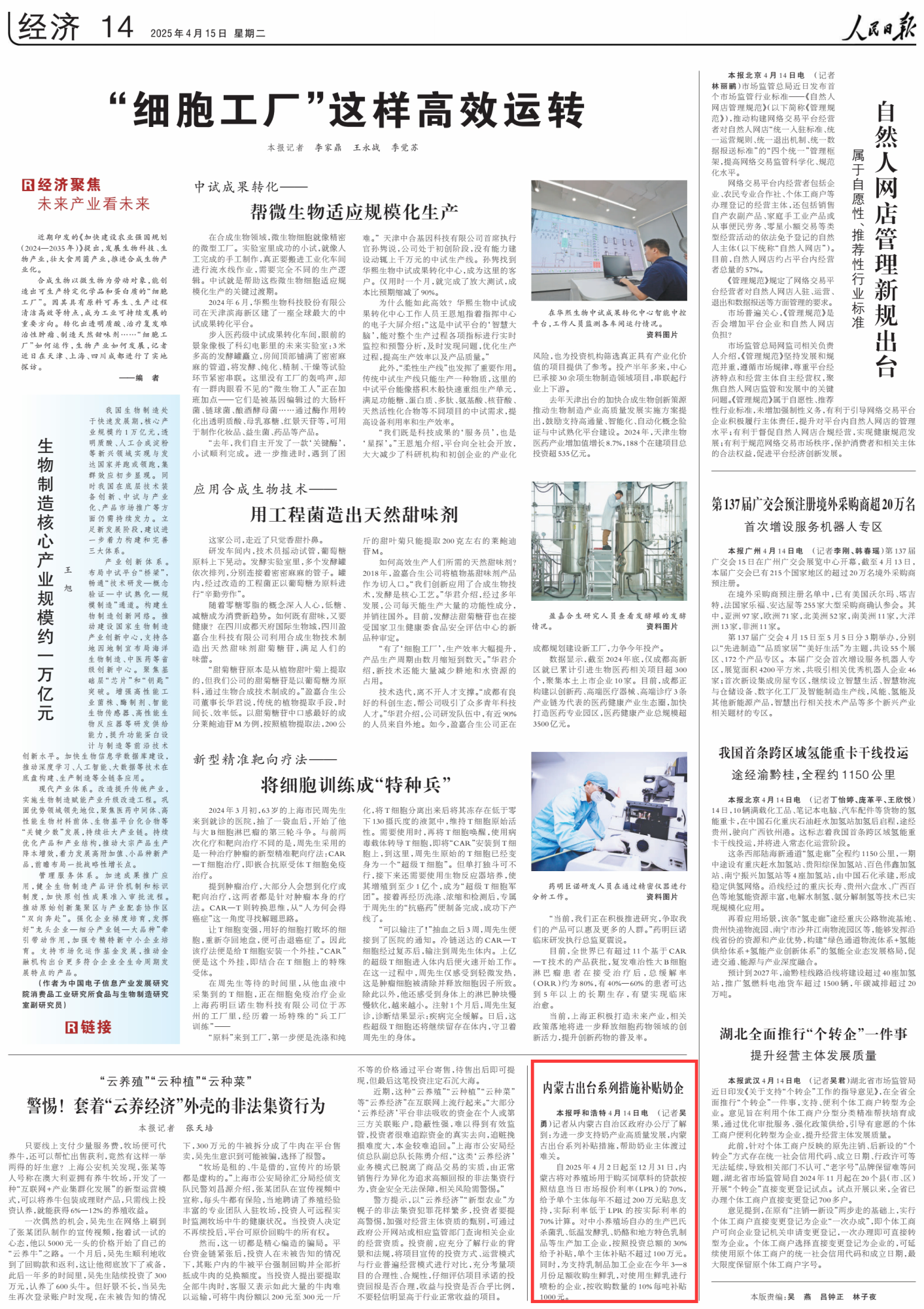 2025年4月15日,《人民日?qǐng)?bào)》第14版刊發(fā)題為《內(nèi)蒙古出臺(tái)系列措施補(bǔ)貼奶企》的文章,報(bào)道了為進(jìn)一步支持奶產(chǎn)業(yè)高質(zhì)量發(fā)展,內(nèi)蒙古出臺(tái)系列補(bǔ)貼措施,幫助奶業(yè)主體渡過(guò)難關(guān)。