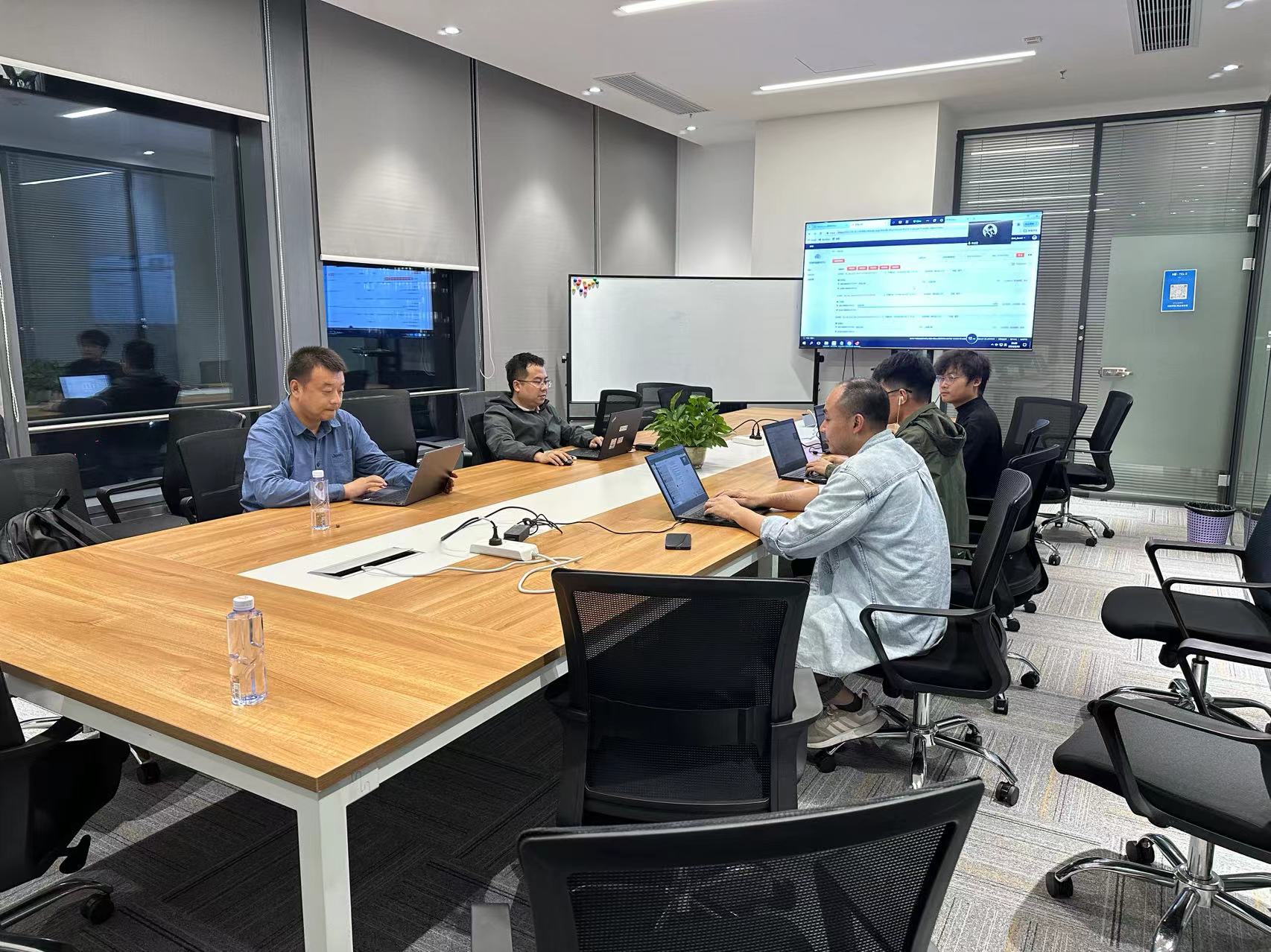 侯曉東帶領(lǐng)團(tuán)隊在討論研究業(yè)務(wù)方案。
